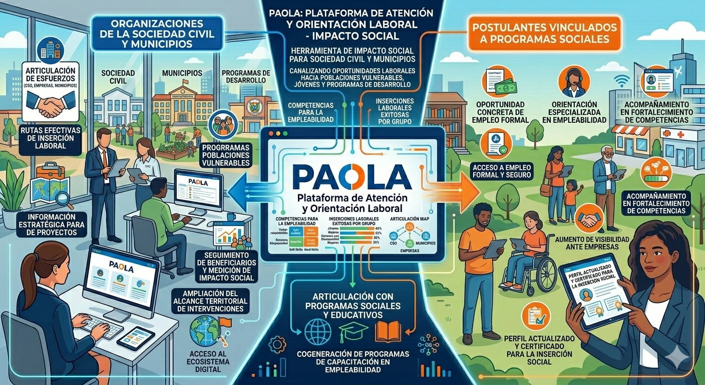 Las organizaciones de la sociedad civil pueden utilizar PAOLA como un instrumento de impacto social para canalizar oportunidades laborales hacia poblaciones vulnerables, jóvenes en transición educativa y beneficiarios de programas de desarrollo. Registrarse permite articular esfuerzos con empresas y municipios, generando rutas efectivas de inserción laboral.
